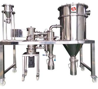 本機(jī)主要有粉碎機(jī)、篩粉機(jī)、旋風(fēng)分離器、除塵布袋,操作平臺(tái)、電器控制箱等部分組成。原料首先經(jīng)過(guò)除鐵器進(jìn)入粉碎機(jī),粉碎后由風(fēng)送到分離器,經(jīng)過(guò)分離器出料口進(jìn)入篩粉機(jī)入料口,由篩粉機(jī)主軸帶動(dòng)絞龍自動(dòng)喂料,同時(shí)帶動(dòng)導(dǎo)向推板將粉末推進(jìn),細(xì)粉經(jīng)過(guò)篩網(wǎng)落入布袋,粗粉返回粉碎機(jī)內(nèi)再粉碎。